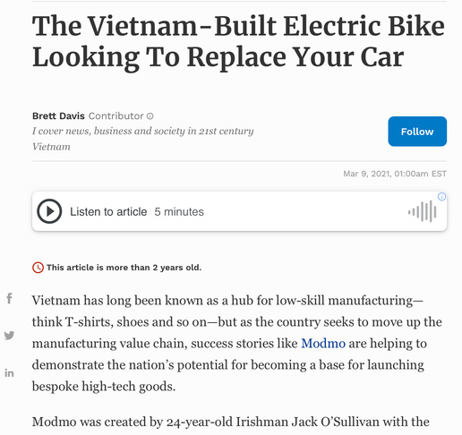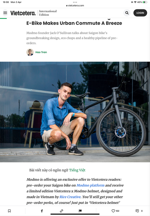After several years of building Vital Fixies and commuting between Asia and Ireland, Jack decided to relocate to Vietnam to work directly with a factory and develop a bike that could replace cars - Modmo. Throughout the Covid-19 pandemic and associated military-lockdowns, Jack stayed in Vietnam and grew the local team to 50 people, who primarily worked on product development and manufacturing.